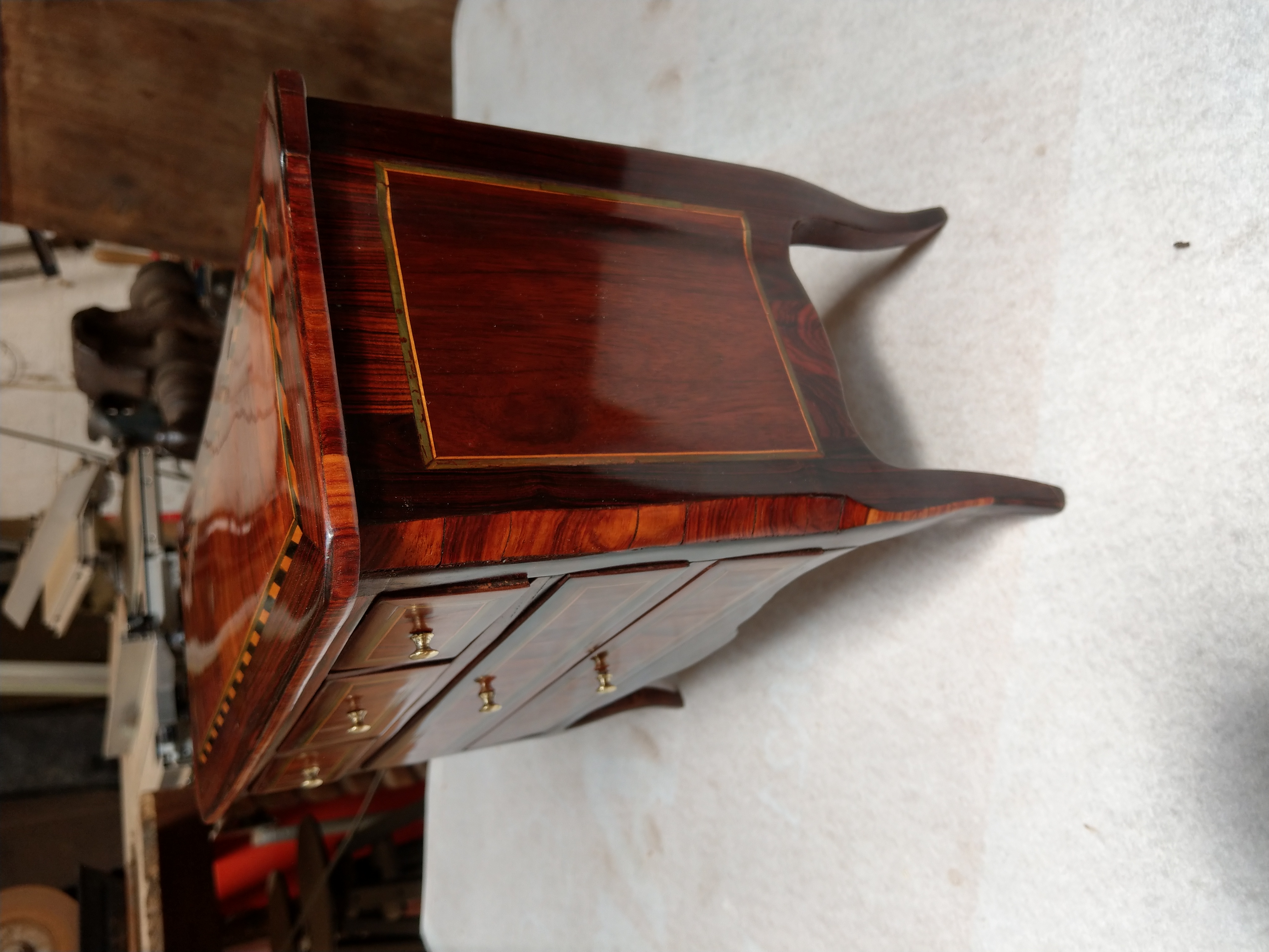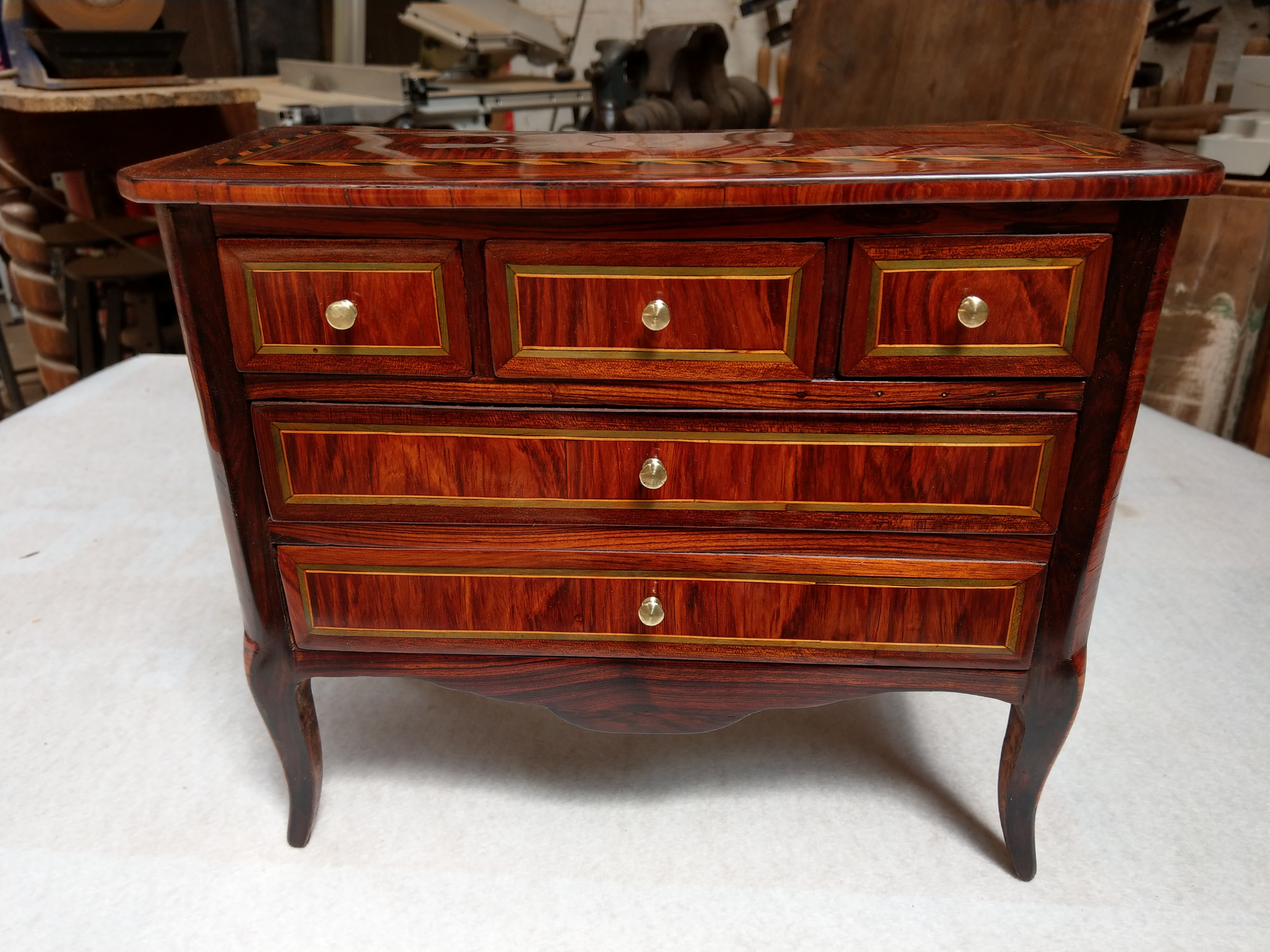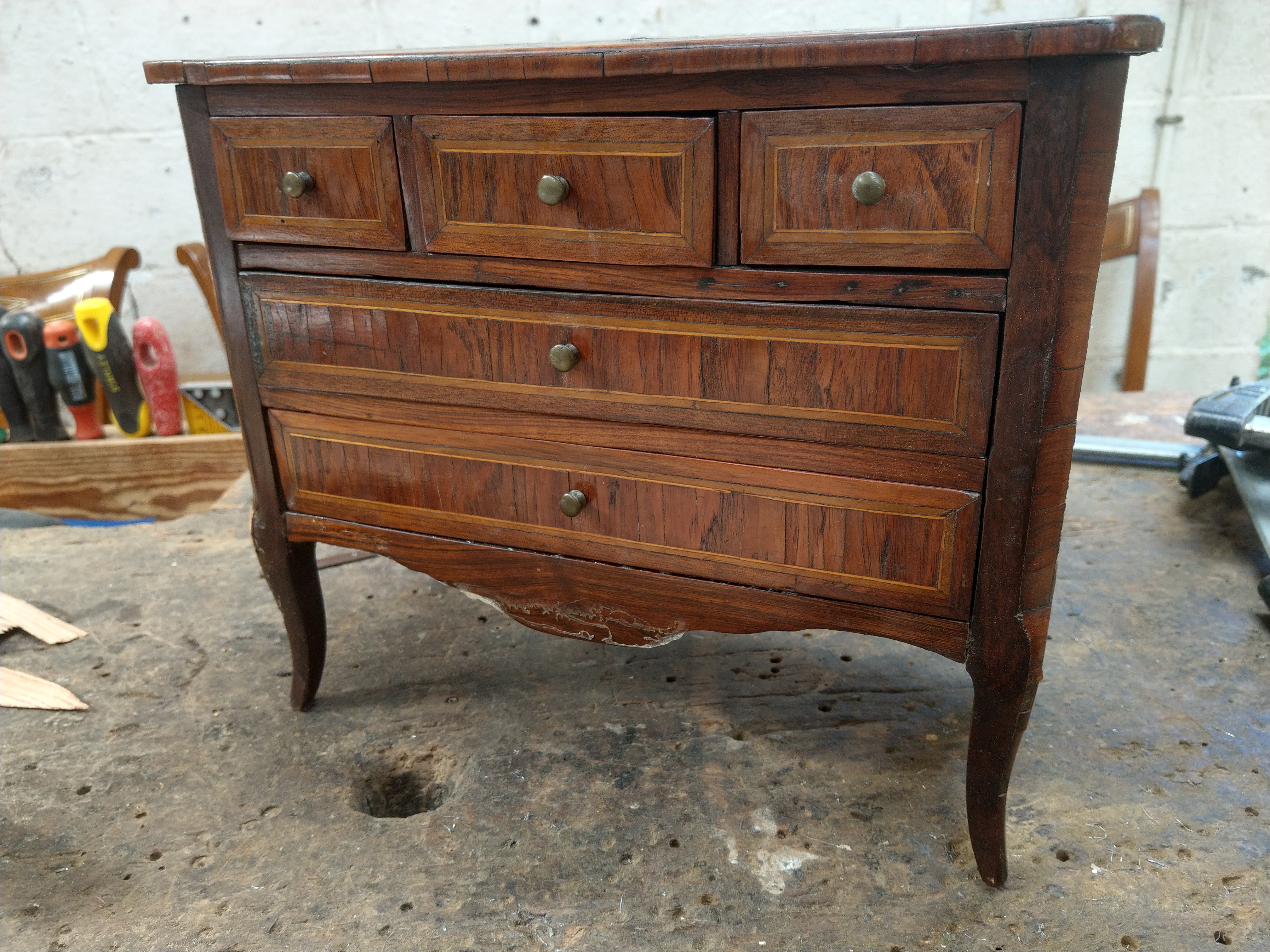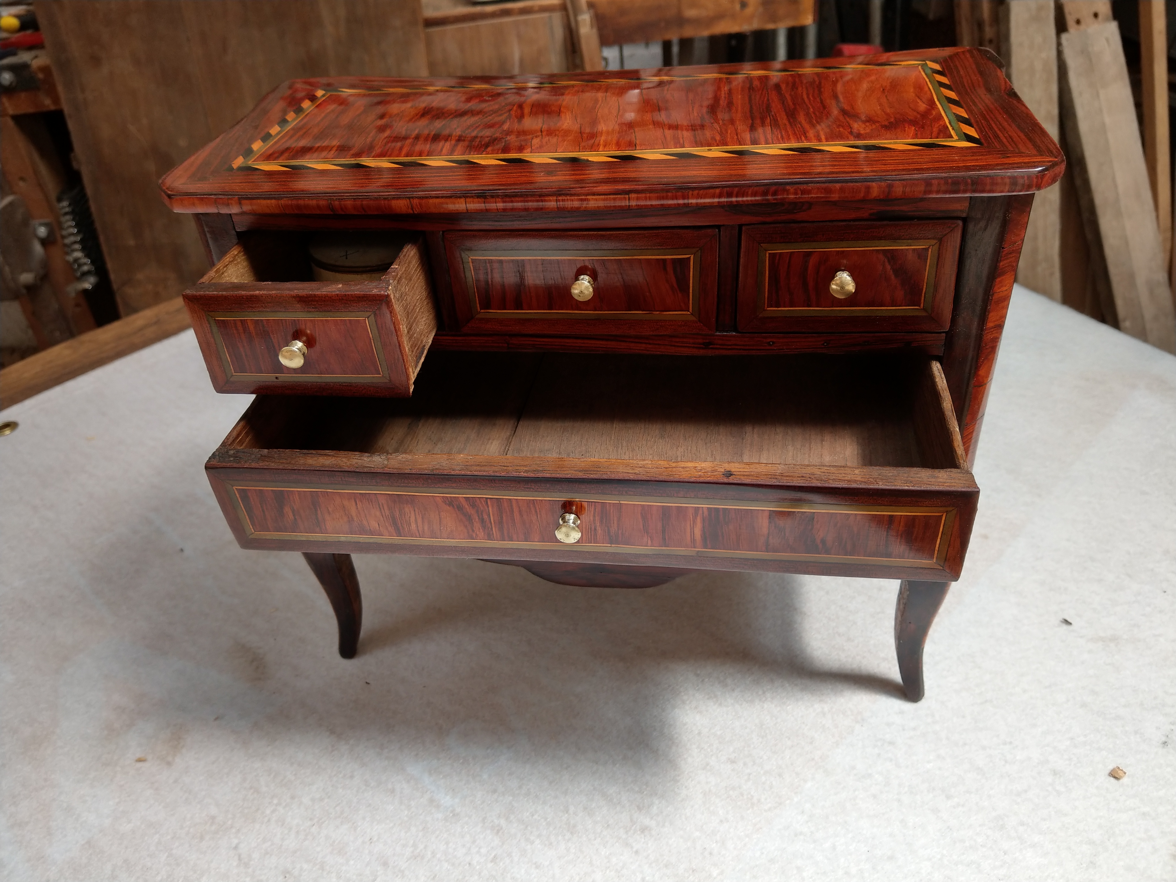 Restauration d'une petite commode en marqueterie d'époque transition (passage du style Louis XV au style Louis XVI)