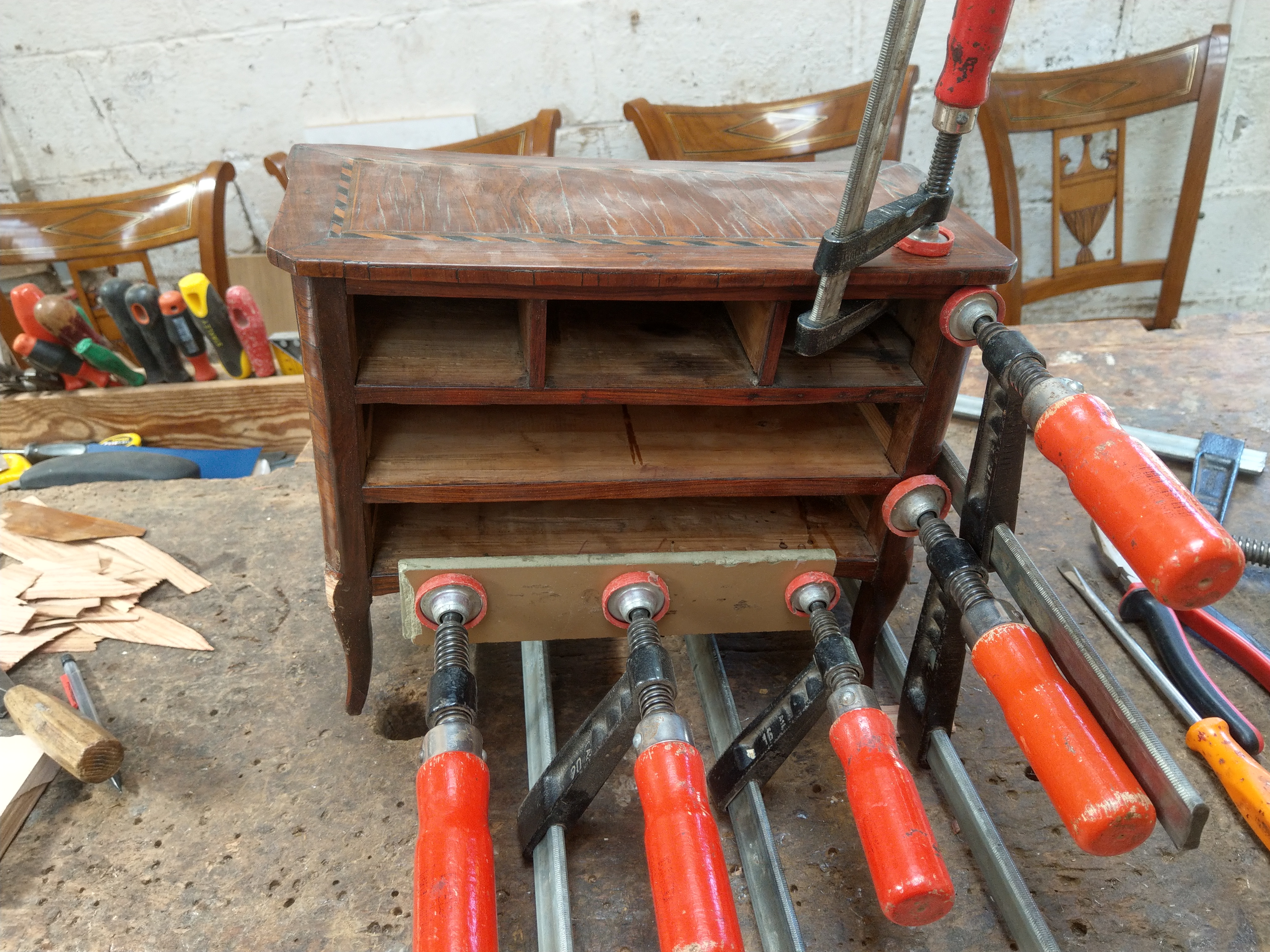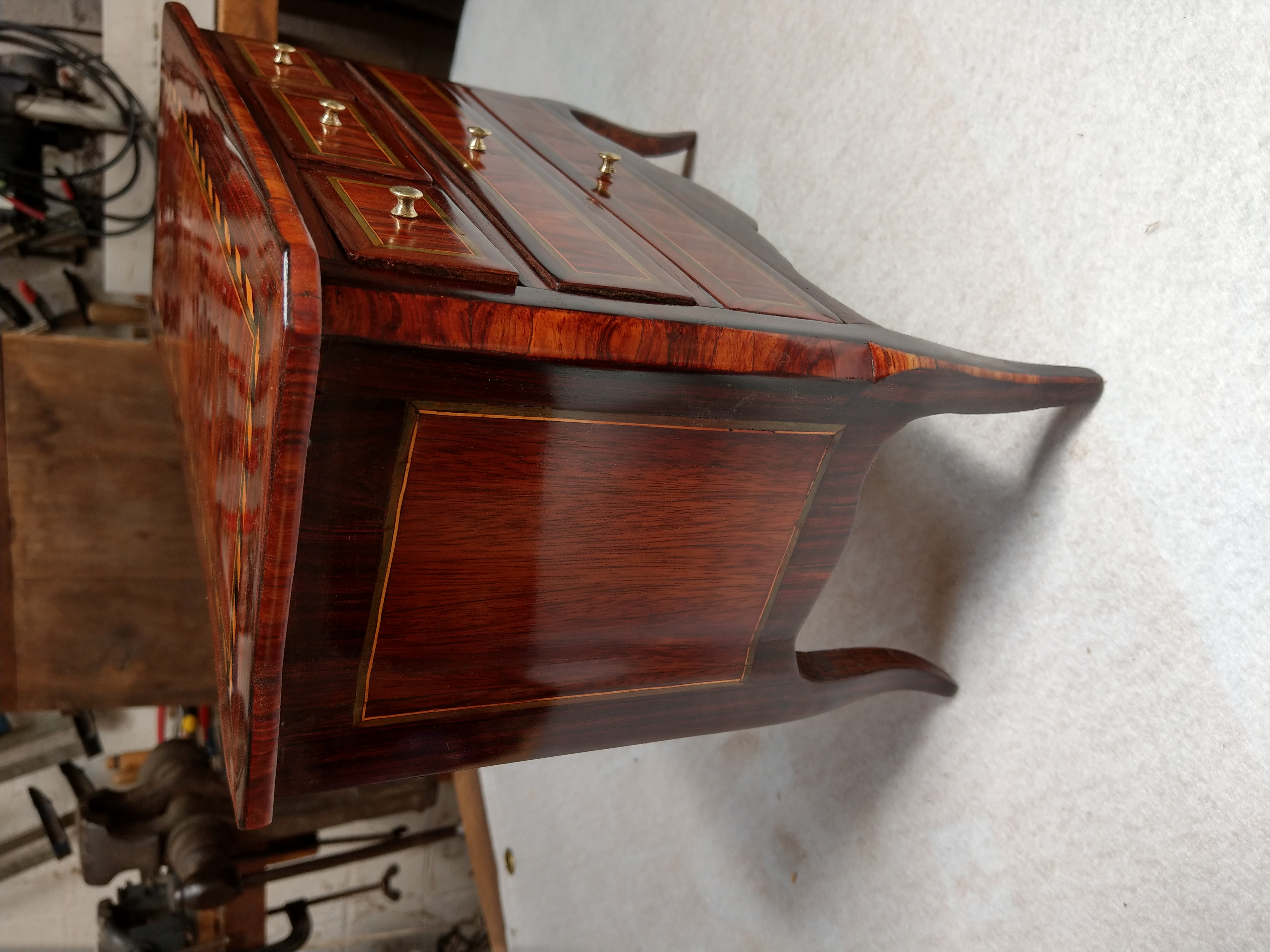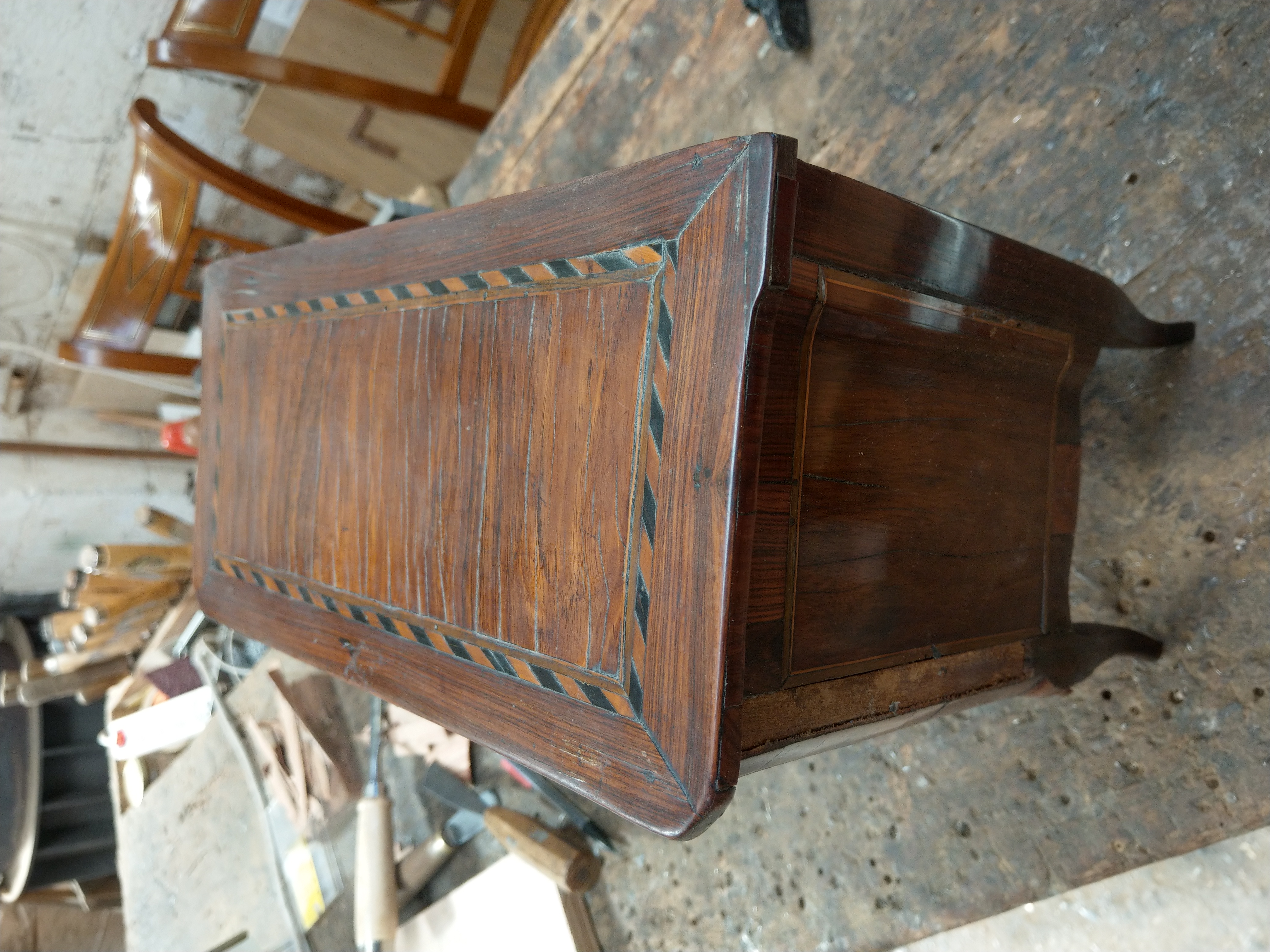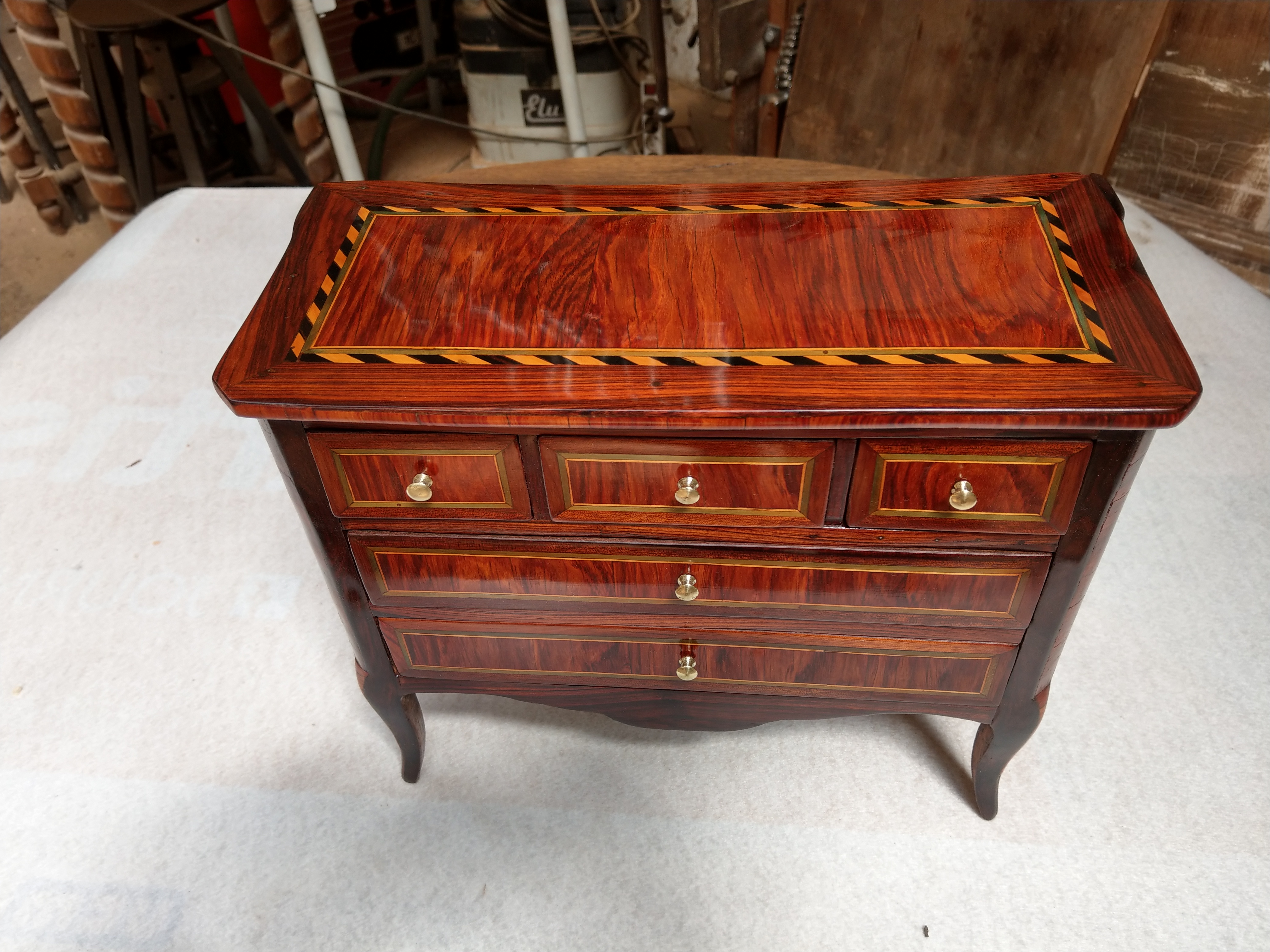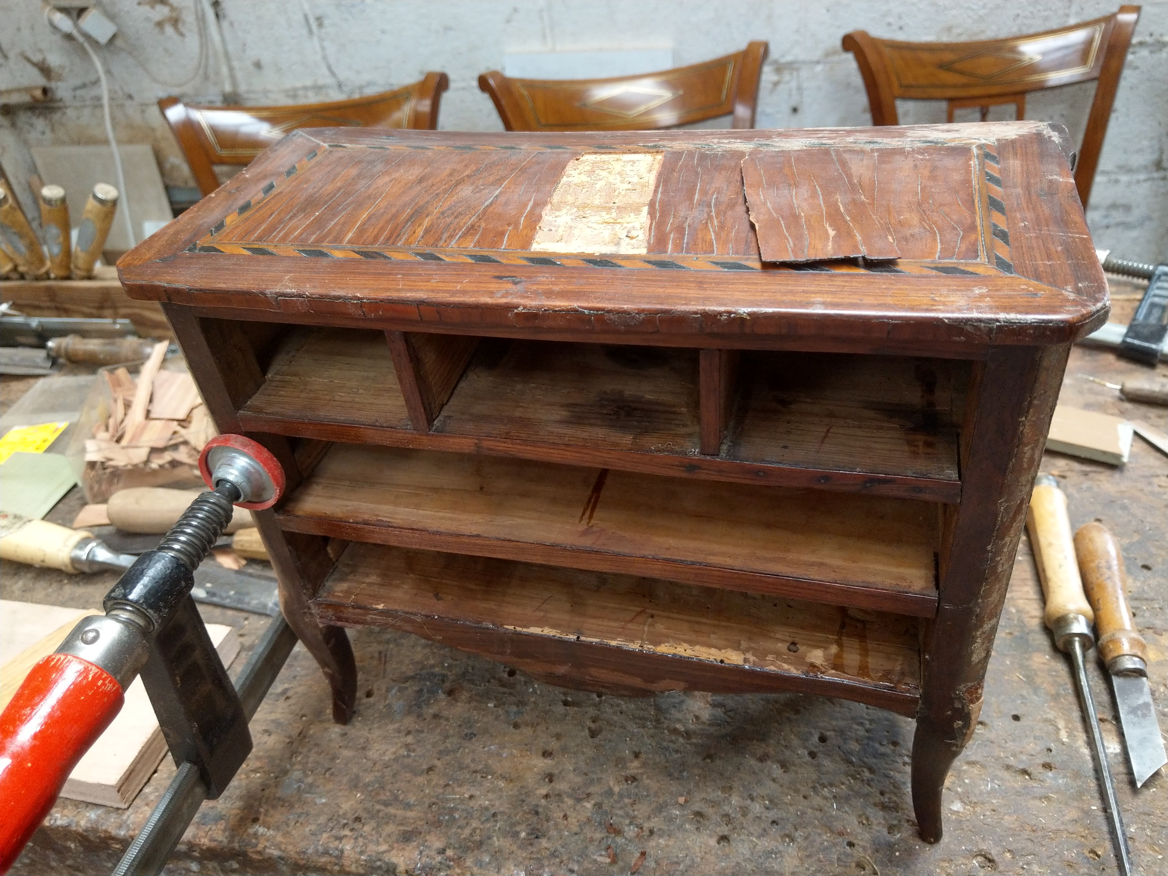 Restauration d'une petite commode en marqueterie d'époque transition (passage du style Louis XV au style Louis XVI)
